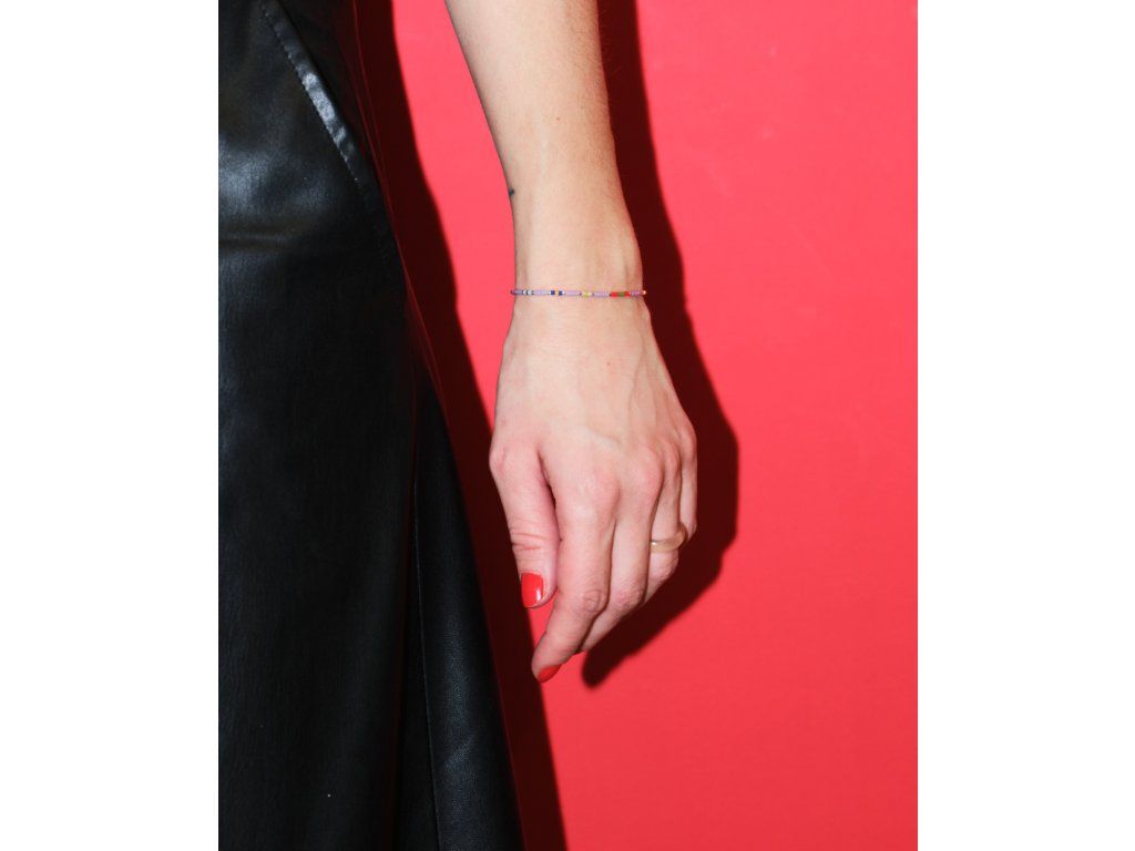 Velikost korálků je cca 1,6 mm. Šňůrka je posuvná a náramek je vhodný na zápěstí o obvodu cca 15-18 cm. Náramek na nylové šňůrce.